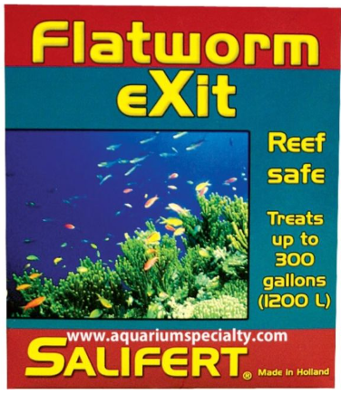 Salifert Flatworm Exit funciona en acuarios de arrecife con problemas de platelmintos. Estos pueden consumir corales y suelen encontrarse al introducir nuevos corales en el acuario. Al usar Flatworm Exit, es necesario seguir las instrucciones, ya que los platelmintos pueden producir una toxina en el acuario después del tratamiento. También podrían ser necesarios varios tratamientos. Salifert Flatworm Exit trata hasta 1200 L (300 galones) de agua.